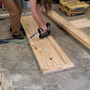 Now that the frame pieces have sat overnight we used Gorilla Wood Glue to attached the pieces to the frame temporarily & came back in with a nail gun to secure them into place. We also used screws that we installed through the back of the door for extra strength & to support the weight of the door.