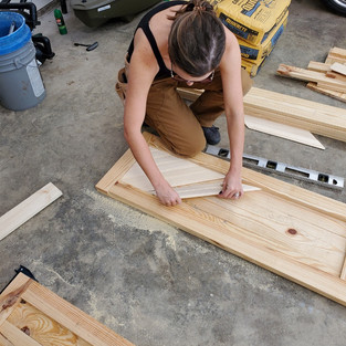 I let this sit overnight and moved on to the framing pieces. Once again I used my 1x6's to create the border of the door. Measuring and cutting/ripping down to size on all four sides of the base, as well as, the piece that I want to attach in the middle of the door.