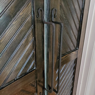I couldn't find a door handle I was happy with, so I went out of the box and used towel bars flipped on their side from Hobby Lobby. I love the rustic masculine look they bring to the doors.